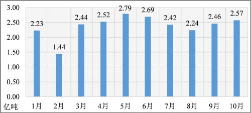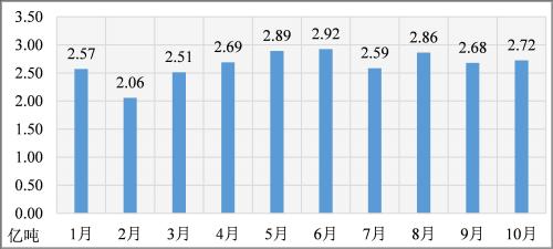 图3:2021年1~10月份全省港口货物吞吐量月度变化趋势